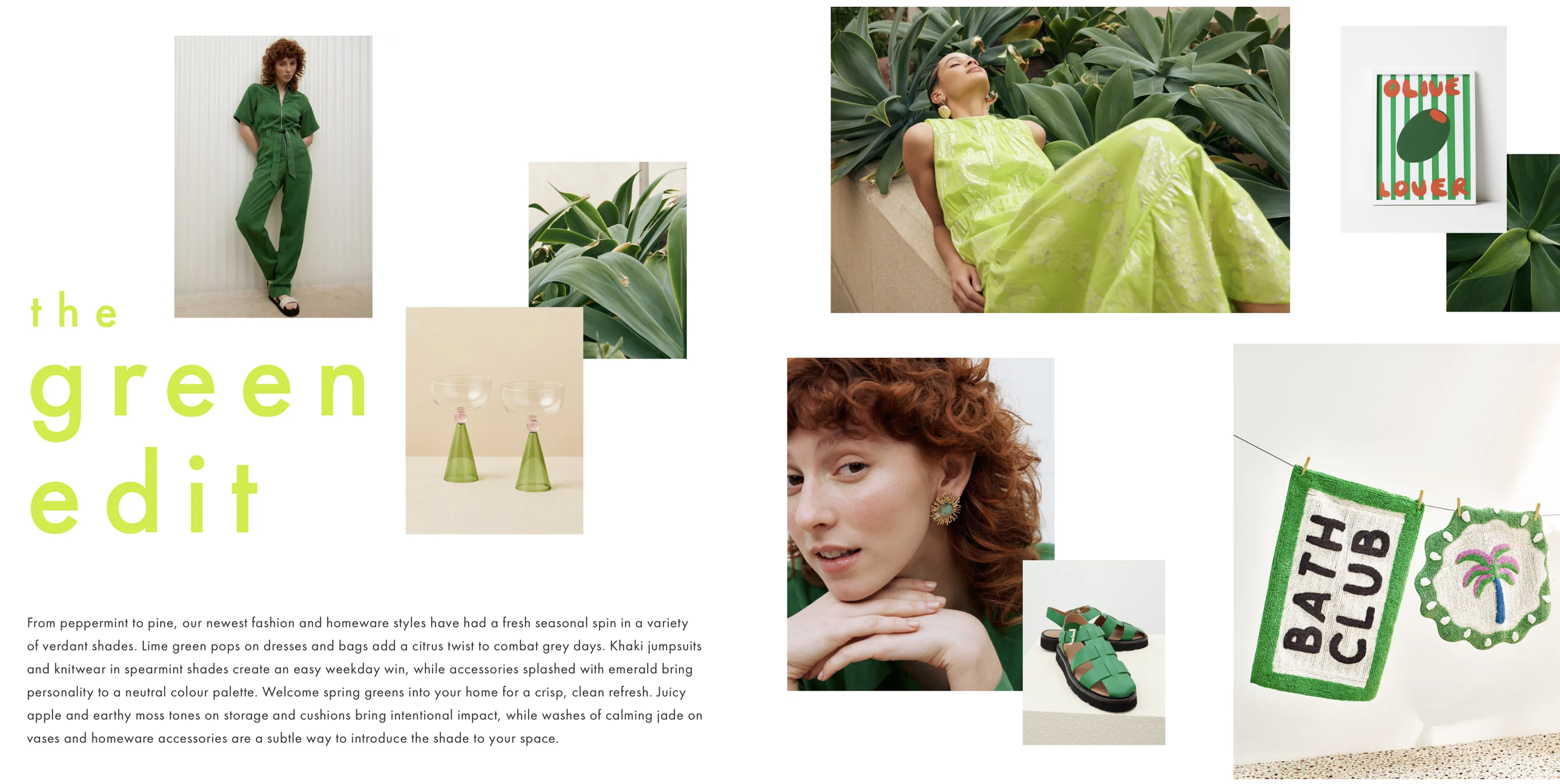 The majority of my role involves the ideation, design and build of various graphics and layouts for Oliver Bonas’ e-commerce website. Outcomes include homepage and landing page designs, banners, ads, social stories, content pieces, lookbooks and more. I create a variety of assets using various components, including photography, digital collage, graphics, illustration, animation, typography and UI/UX design.